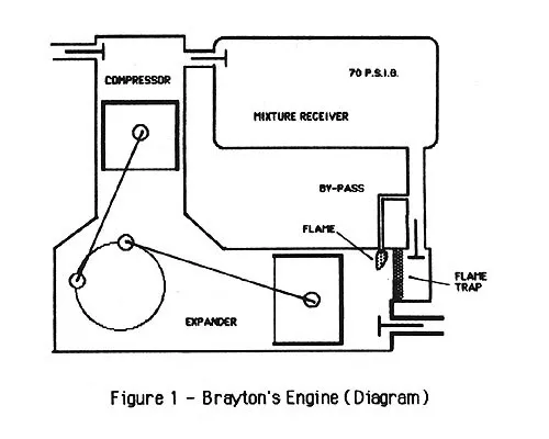 Braytons Patentmotor von 1872 war ein Zweitaktmotor, bei dem zwei Kolben an einer gemeinsamen Pleuelstange montiert waren. Der kleinere der beiden Kolben fungierte als Luftpumpe und komprimierte die Luft auf etwa 65 psi (4,5 bar). Ein gasförmiger Brennstoff, beispielsweise Leuchtgas oder vergaster Wasserstoff, wurde mit der in den Kompressionszylinder eintretenden Luft vermischt. Alternativ könnte ein Ölkraftstoff wie Naphtha verdampft und der in den Kompressionszylinder eintretenden Luft hinzugefügt werden. Das Luft-Kraftstoff-Gemisch wurde dann komprimiert, durch ein Ventil geleitet und in einem Behälter gespeichert. Eine vom Motor angetriebene Nockenwelle öffnete ein Ventil, das es dem unter Druck stehenden Luft-Kraftstoff-Gemisch ermöglichte, aus dem Behälter in den großen Verbrennungszylinder zu strömen. Bevor das Luft-Kraftstoff-Gemisch in den Zylinder gelangte, passierte es Schichten aus Drahtgeflecht, in denen ständig eine kleine Zündflamme brannte. Die Zündflamme wurde durch eine kontinuierliche, kleine Zufuhr des Luft-/Brennstoffgemisches am Brennen gehalten. Wenn die Ladung durch das Drahtgeflecht hindurch in den Zylinder gelangte, wurde sie von der Zündflamme gezündet. Die verbrennenden und expandierenden Gase erzeugten einen Druck von etwa 45 psi (4,1 bar), der den großen Kolben in seinen Zylinder zurückdrückte und so den Krafthub erzeugte. Gleichzeitig wurde der kleine Kolben in seinem Zylinder in Richtung des oberen Totpunkts bewegt und komprimierte eine weitere Ladung Luft für den weiteren Betrieb.
